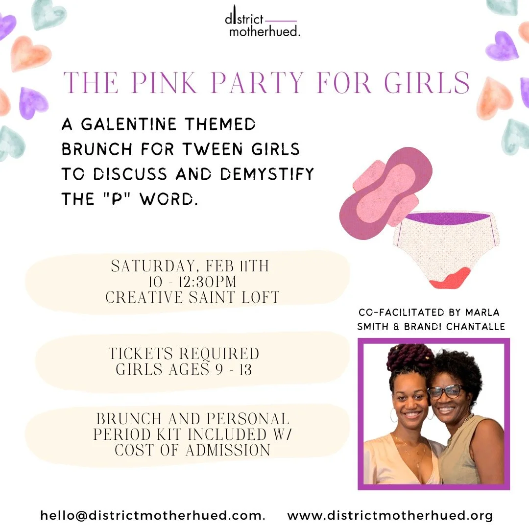 WHAT: Join us for a galentine themed brunch and a guided discussion intended to normalize the topics of menstruation and puberty. For girls ages 9-13, this is a space where usage of varying period products is taught, curiosity is encouraged, and participants leave with a "personal period kit". The Pink Party For Girls will feature a brunch spread, a guided discussion, and a galentine arts and craft activity.
